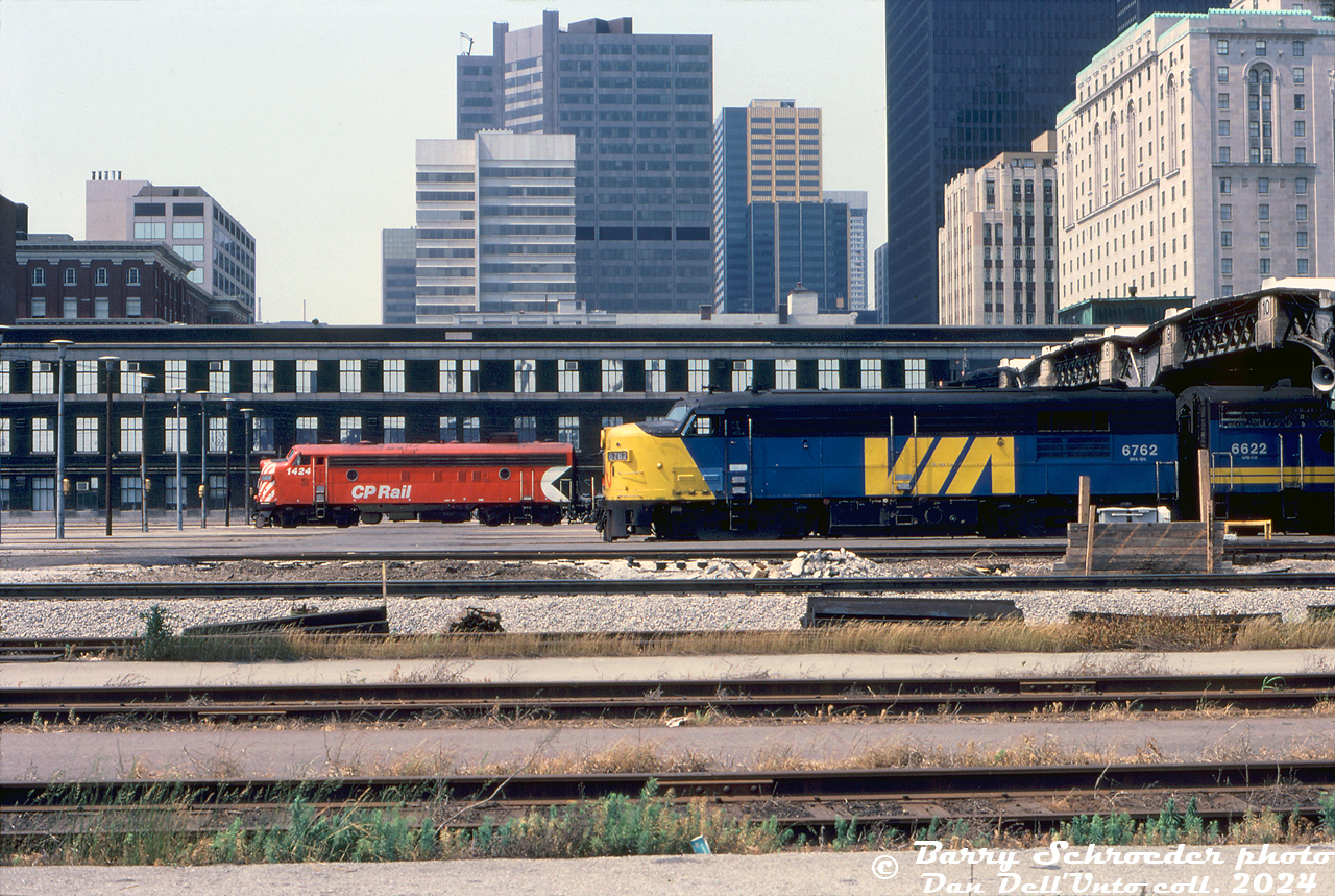 Caption: VIA FPA4 6762 and F9B 6622 sit on a passenger consist on Track 10, poking out of the west end of Union Station's train shed in downtown Toronto. A few tracks down, VIA's "The Canadian" consist sits with on Track 4, with CP FP7 1424 (and GP9 8517) on the head-end. VIA had taken over CP's passenger services last fall, and plenty of the ex-CP power was still in full CP colours (the 1400-series F-units were sold to VIA, but the steam generator-equipped GP9's were retained by CP and used as passenger protection power when needed).