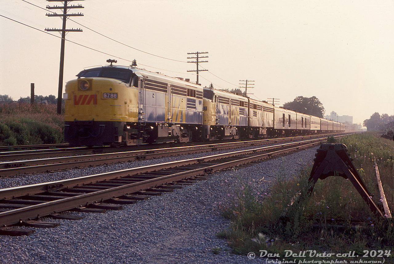 Caption: A morning westbound VIA passenger train speeds through Scarborough with three MLW's on the head-end: FPA4 6788 and 6769, sporting VIA paint and logos, and an unknown 6800-series FPB4 still in CN zebra stripe paint. Nine passenger cars trail, including two baggage cars (most appear to still be in CN paint, as the new "VIA" branding was barely two years old at this point). It won't be long before the train covers its final miles and arrives at Union Station in downtown Toronto.