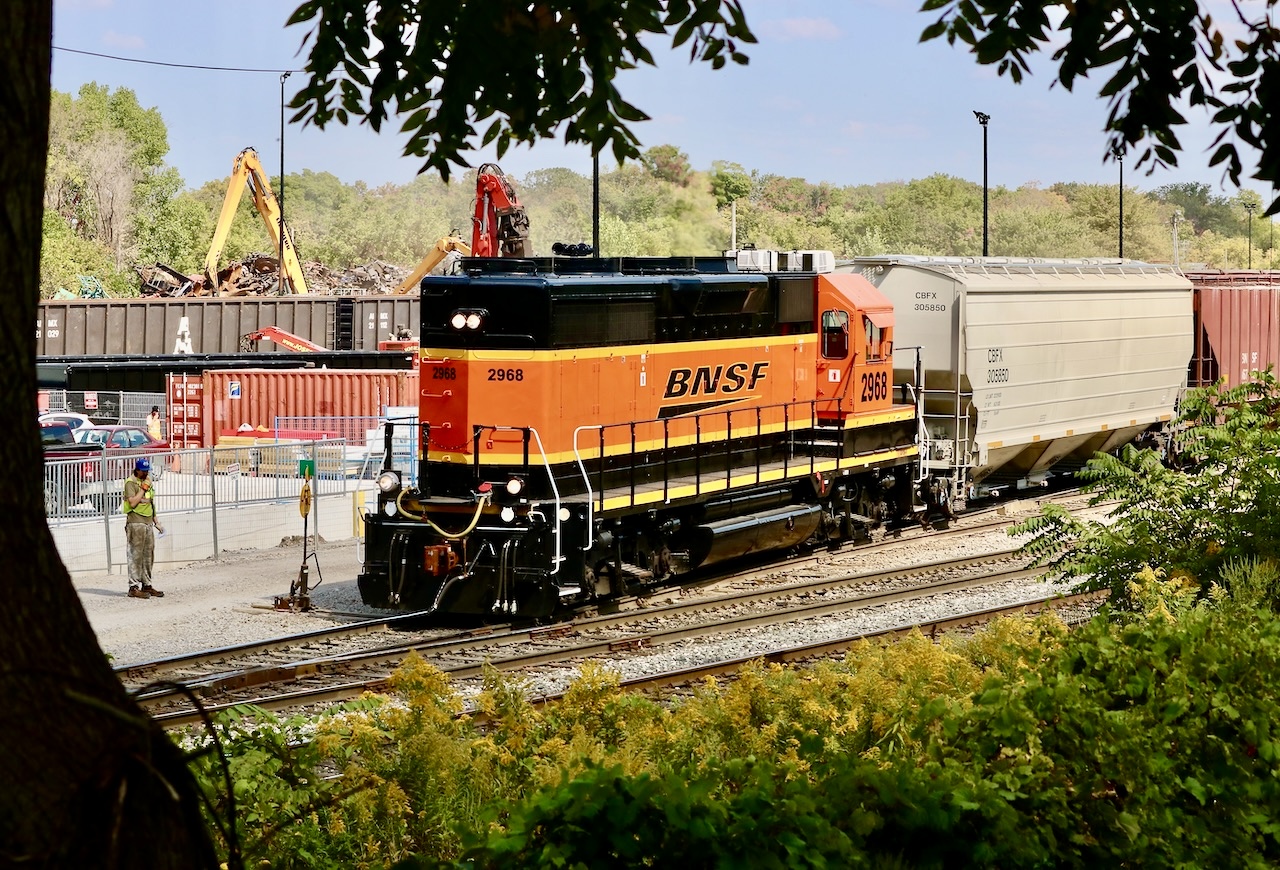 A diamond in the rough. Pristine looking BNSF GP39V  2968 certainly doesn’t show its age with a nice coat of BNSF paint. Original built as a GP35 for the GM&O back in the 1960, complete with second hand Alco trucks. When BN approached VMV years ago for an option for secondhand four axle units, rebuilding old GP30’s and GP35’s became the reality, especially considering the number of hulk VMV could get its hands on. The GP35 was well known for maxing out its prime mover and often damaging its electrical system in the process, often sidling the model with electrical fires, which made them candidates for early retirement. Thankfully EMD later came out with the dash-2 electrical system, which helped eliminated a lot of headaches.  Today CN is still short of four axle power and has been turning to BNSF to fill the void. I was shocked to see this nice clean unit working Kitchener yard Monday.  Unfortunately the stalled 533 Sunday and derailed 540 Monday killed any chance of getting a 568 this day.