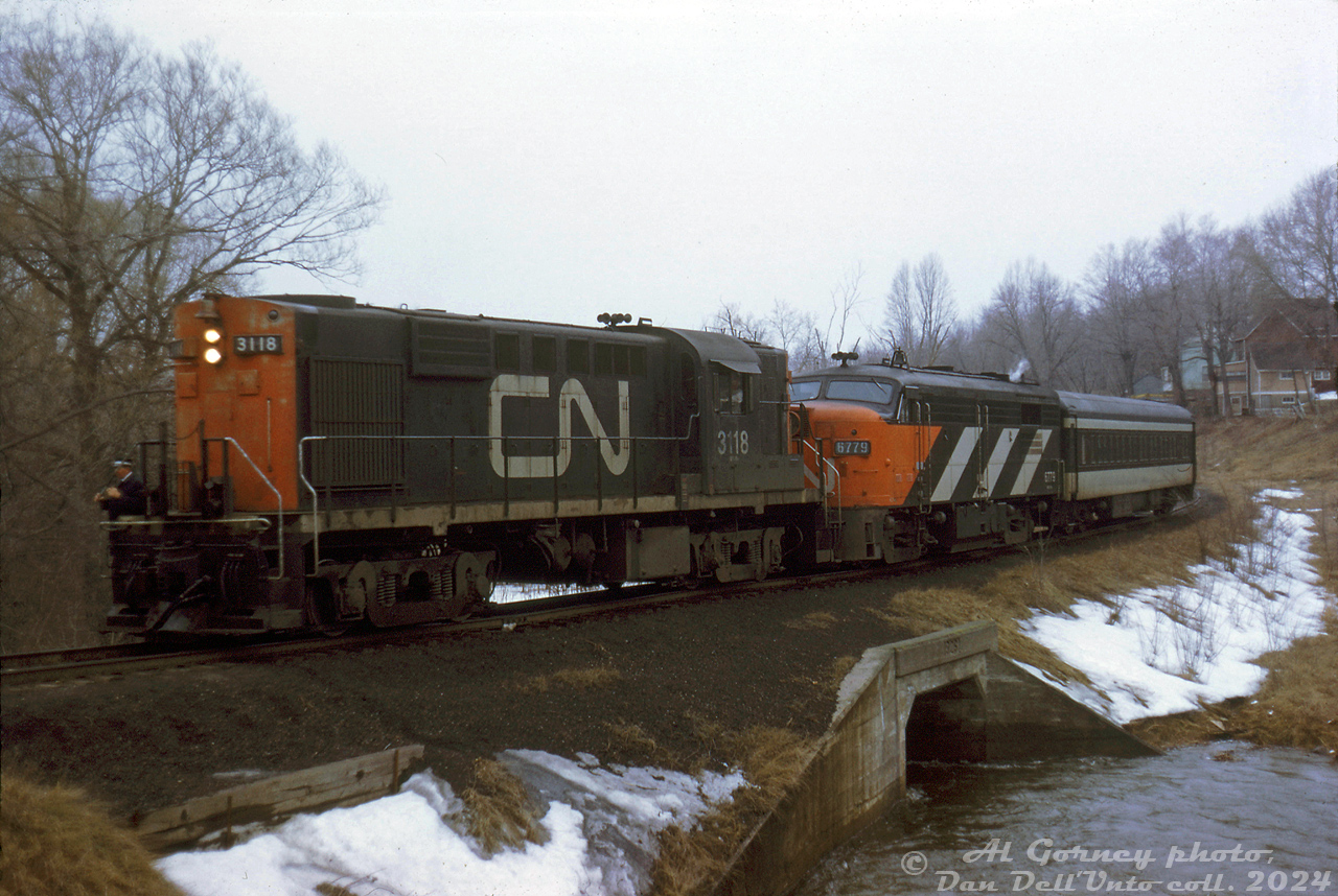 Caption: CN RS18 3118, FPA4 6779 and a single passenger car work their way back to the station on the Brockville Loop Line after visiting the Brockville wye (located amid a residential area to the southwest of the CN station area). After some research and input from others train appears to be heading eastbound on the north end of the Brockville Loop Line, crossing over a culvert for Butler's Creek and approaching Perth Street crossing. The houses in the background appear to be along Hubbell Street.