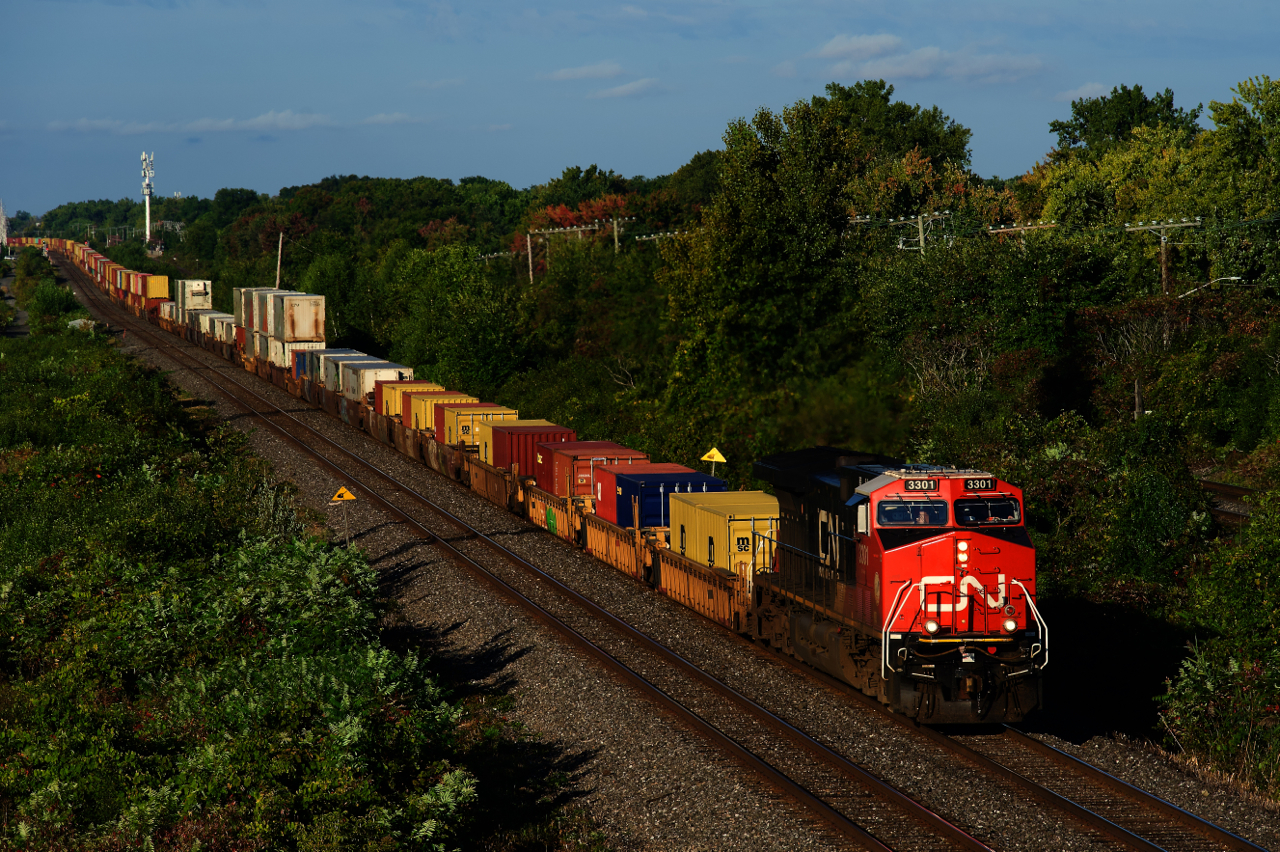 A rebuilt GE leads CN 106 through Beaconsfield.