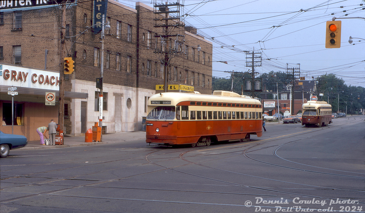 Caption: TTC PCC 4744 in "subway red" paint (A13-class, built by Pullman in 1947 for Birmingham, Alabama) turns westbound onto The Queensway off Roncesvalles on a Dundas short-turn, returning to nearby Roncesvalles Carhouse after morning rush hour. TTC 4653 (A11-class, built by Pullman in 1946 for Cleveland) follows behind, another Dundas car returning to the carhouse. Both are passing the old Edgewater Hotel and the Gray Coach terminal in Sunnyside.