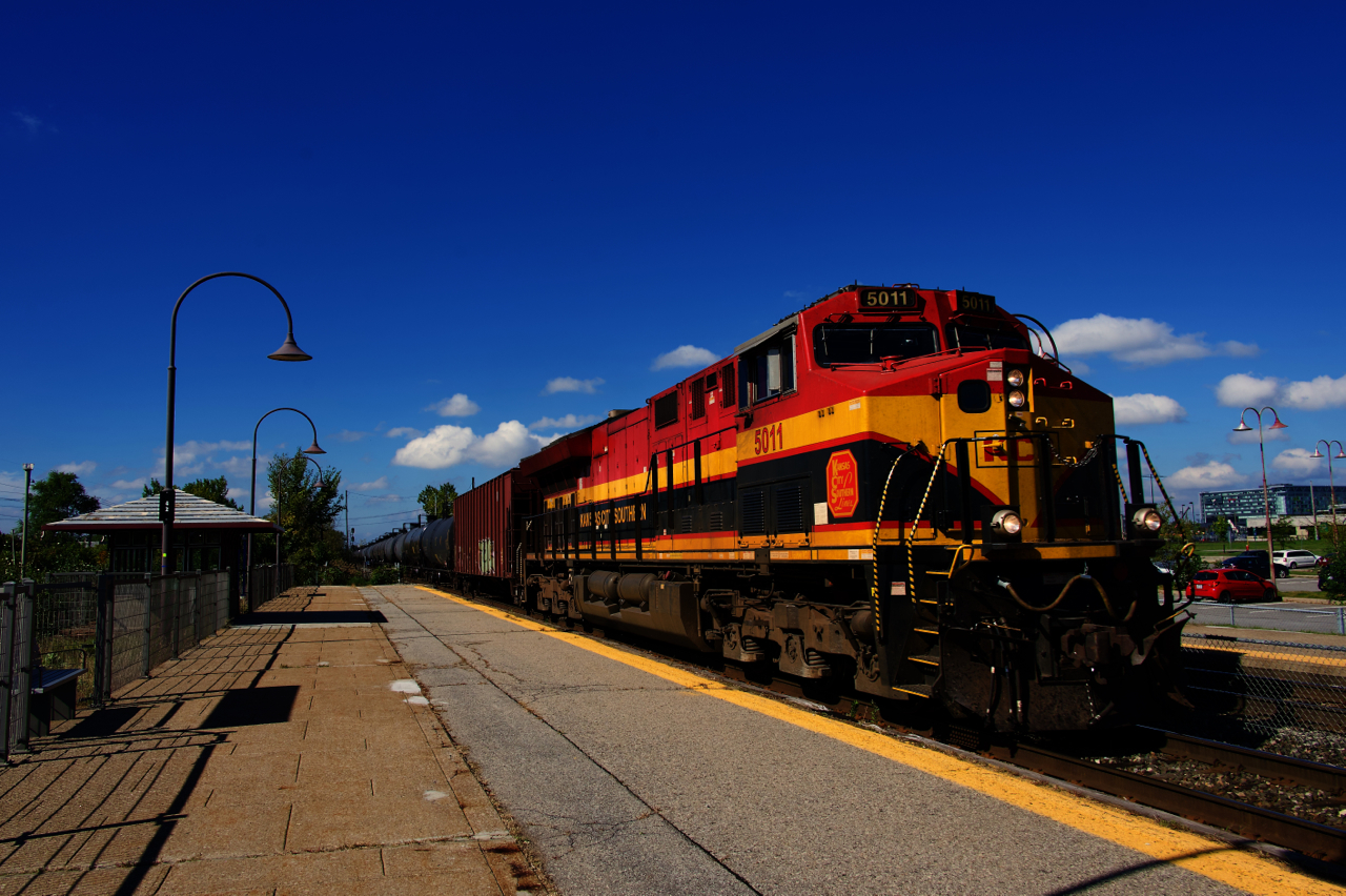 Caption: KCS 5011 leads ethanol train CPKC 528 through the EXO Dorval Station. After a quick crew change it will continue towards Albany.
