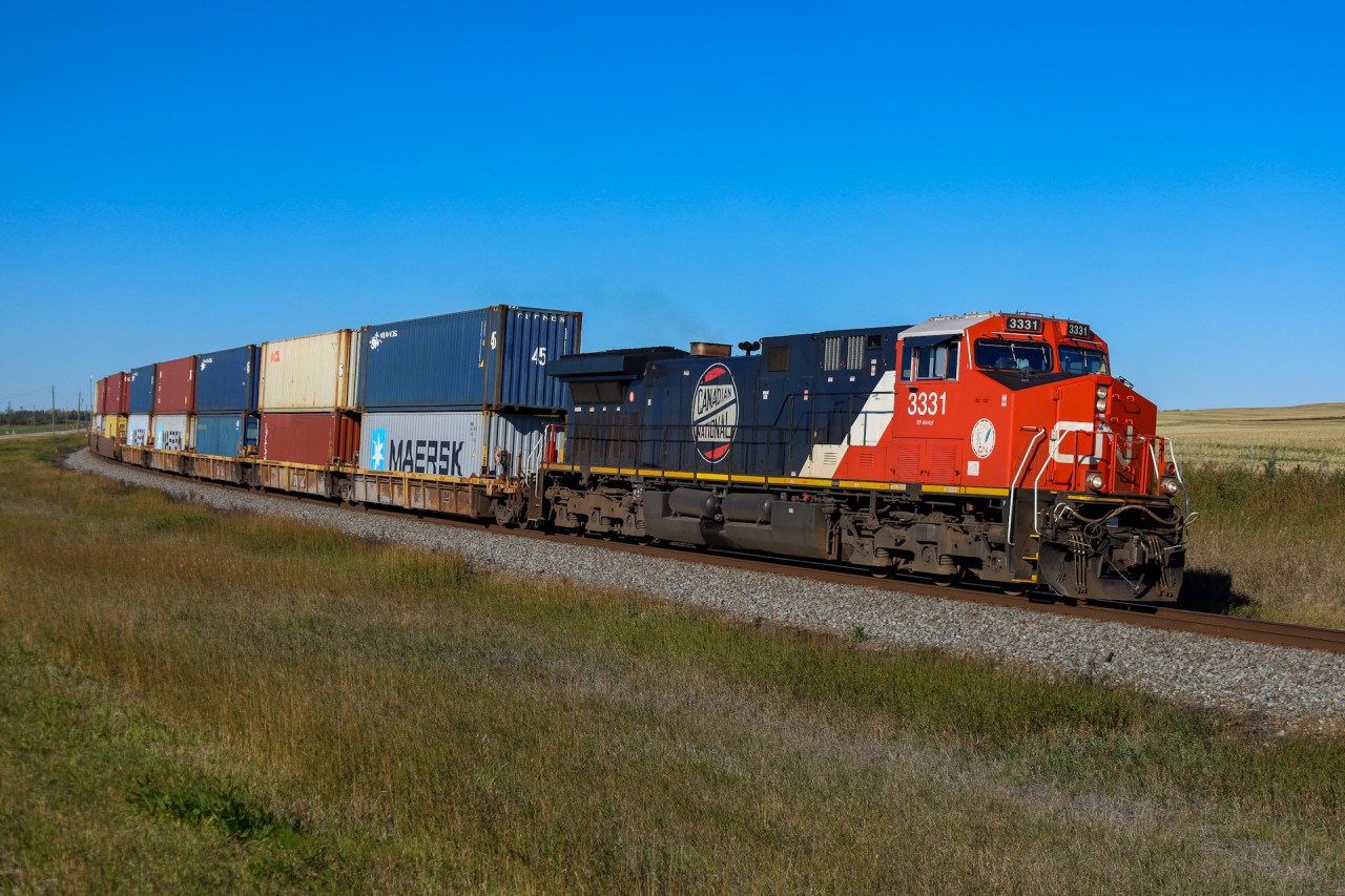 Caption: CN Q 18051 27 highballs through Greenshields after a quick crew change in Wainwright and a meet with Q 18521 27 on the double track. CN 3331 is one of two units featuring logos from CN’s past; The round Canadian National logo is a modification of the Canadian Northern (CNoR) logo and was utilized for a few years after CN’s inception in 1919. Both retro logo units CN 3309 and CN 3331, typically operate in the Chicago to New Orleans corridor, staying close to Homewood for executive train service and on rare occasion escape that corridor in freight service. And yes, the “CNoR heritage” unit is flying down the old Grand Trunk Pacific mainline - home rails for the Canadian Northern are about 45 minutes north of this location on the Blackfoot and Vegreville Subs!
