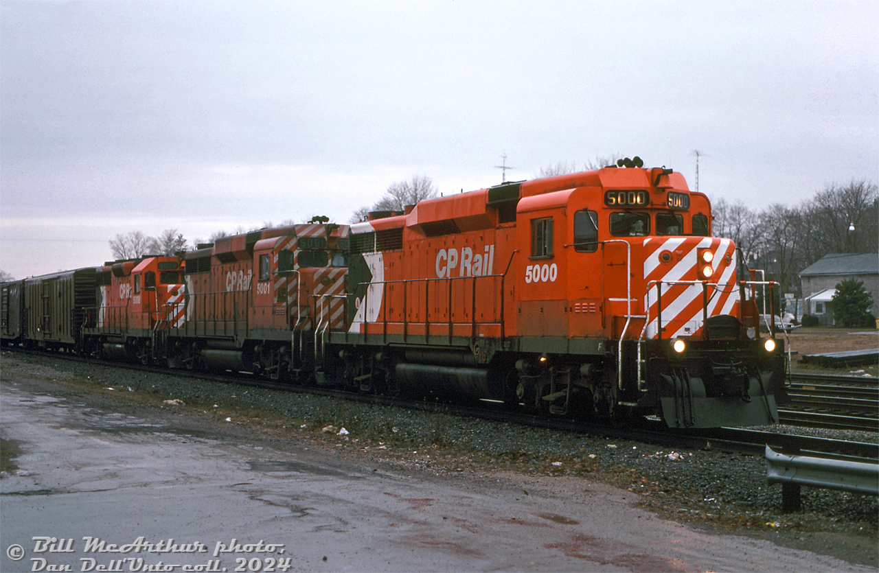 In their early days the two CP GP30's (the only Canadian-built GP30 units at that) could often be found paired together, but by the 70's both were mixed in general freight service with CP's large fleet of 4- and 6-motor units, and it became somewhat harder to catch the duo working the same train. But apparently the stars aligned on this day, and both GP30's must have been at the same shop at the same time for some power planner or shop foreman to line up both together for a freight, elephant style, with a successor GP35 (5008) to boot. The occasion was not lost on Bill, who made sure to note "LOOK AT POWER!!" on the slide mount.