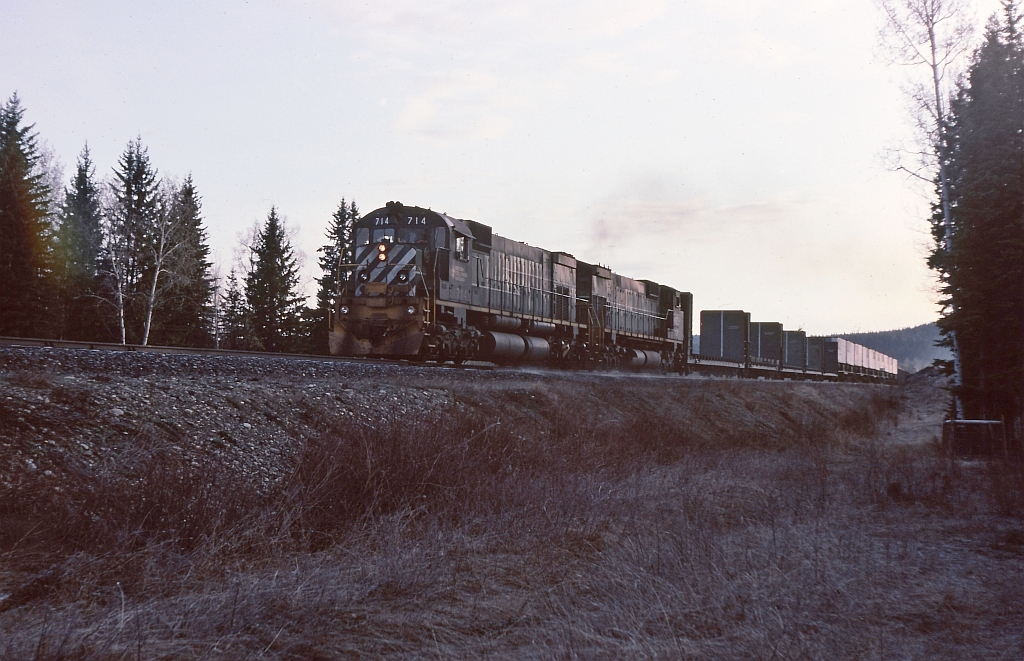 A frosty morning early May 1985.  BCOL 714 leading time table scheduled train #32, the PV symbol and approaching the north switch Crysdale siding.  I was on a northbound freight in the siding waiting for this meet and on the ground doing a roll by inspection.  It's all memories now. I could not attach GPS coordinates. Crysdale siding was mile 440.3, about halfway between Hixon and Prince George.