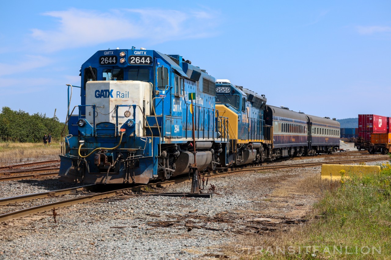GMTX 2644 leading NBSR Work Extra with CSX geometry train, CSXT 9939 trailing, CSXT 994365 ‘Hocking Valley’ and CSXT TGC3 Track Geometry Car in tow, testing from McAdam, NB to Port of Saint John, NB on Aug 15, 2024.
