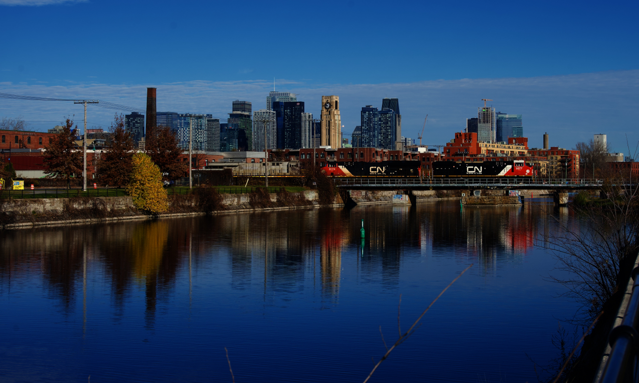 Caption: Gleaming CN 3377 leads CN 120 over the Lachine Canal with intermodal traffic for The Maritimes.