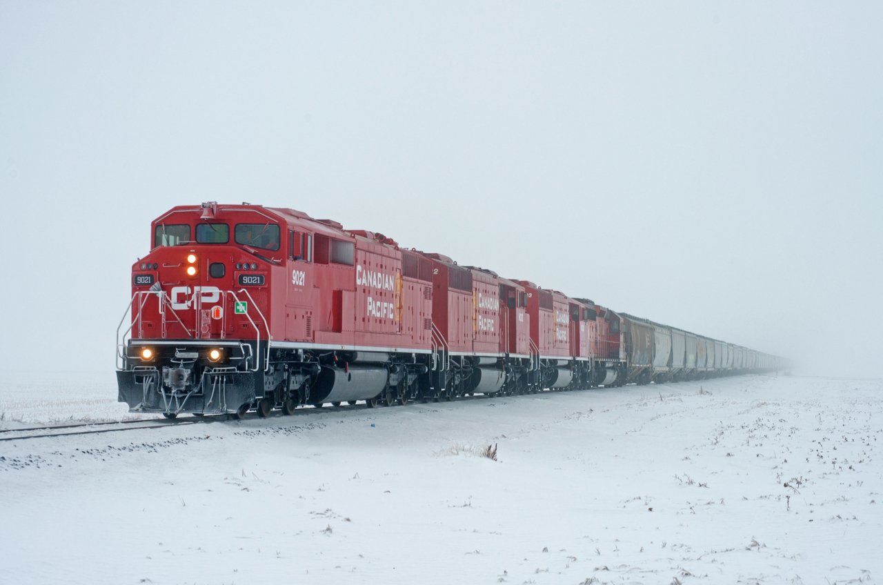 Caption: Despite the thick ice-fog, a four-pack of SD40-2s leading a loaded grain train on the mainline is worth going out for. CP 9021, 9022, 9023, and 5875 do the honours of leading train E08 into Regina from the Last Mountain Elevator.