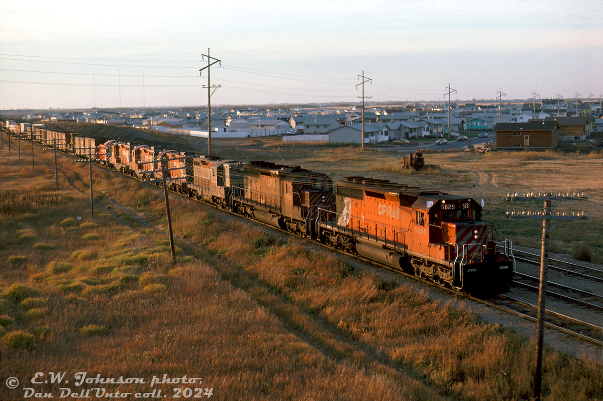 Caption: There's no shortage of power on this extra freight rolling into Saskatoon, seen passing through the suburbs of Sutherland at the Highway 5/College Dr. overpass before arriving at CP's Sutherland Yard. CP SD40-2 5625 and 5582 lead GP9 units 8484 (still in maroon & grey script paint), 8701, 8683 and 8685, and a fresh-looking SW900 6711 trailing with stack capped.