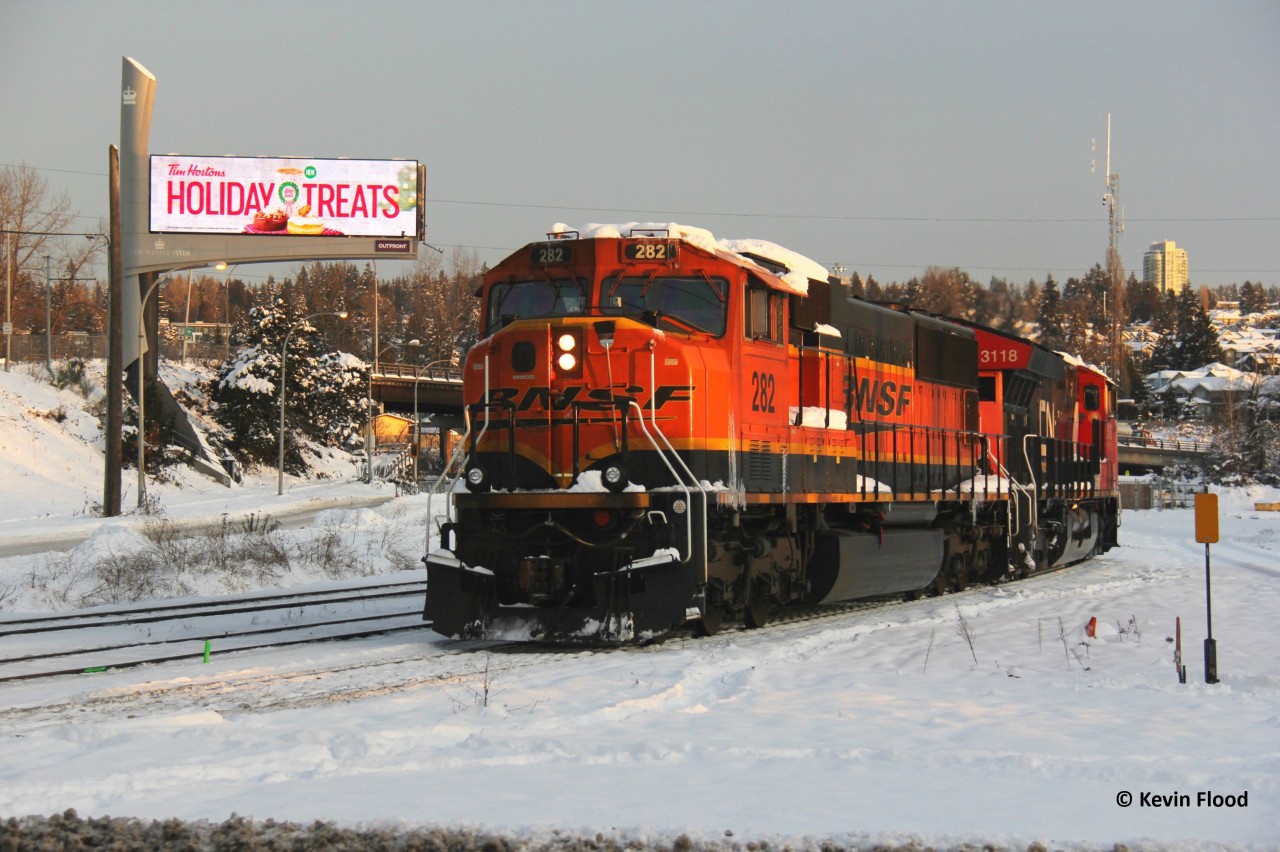 Caption: A light power move was pictured at Braid Jct. on the CN New Westminster Sub with BNSF 282-CN 3118. Merry Christmas to everyone!