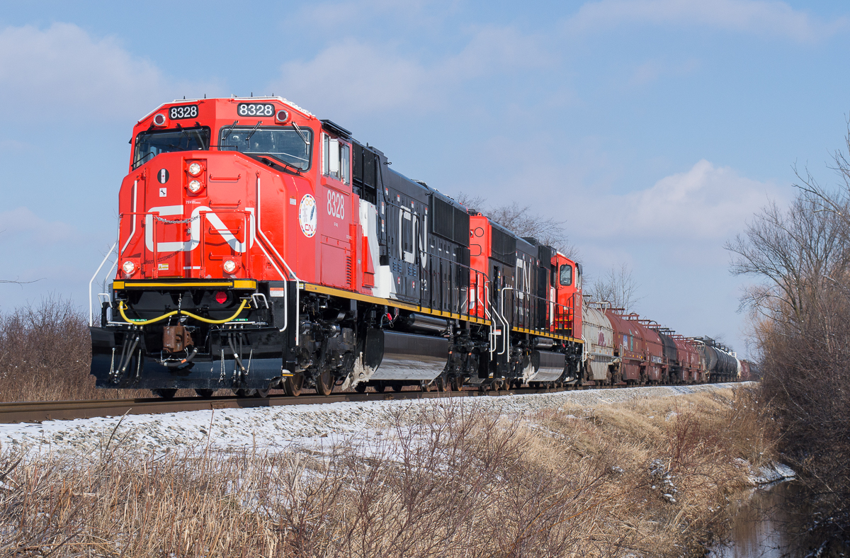 Caption: CN L502 is on the last leg of their trip from Sarnia to Garnet as they approach the grade crossing at Sandusk Road. Leading the train is brand new SD75iACC's 8328 and 8317.