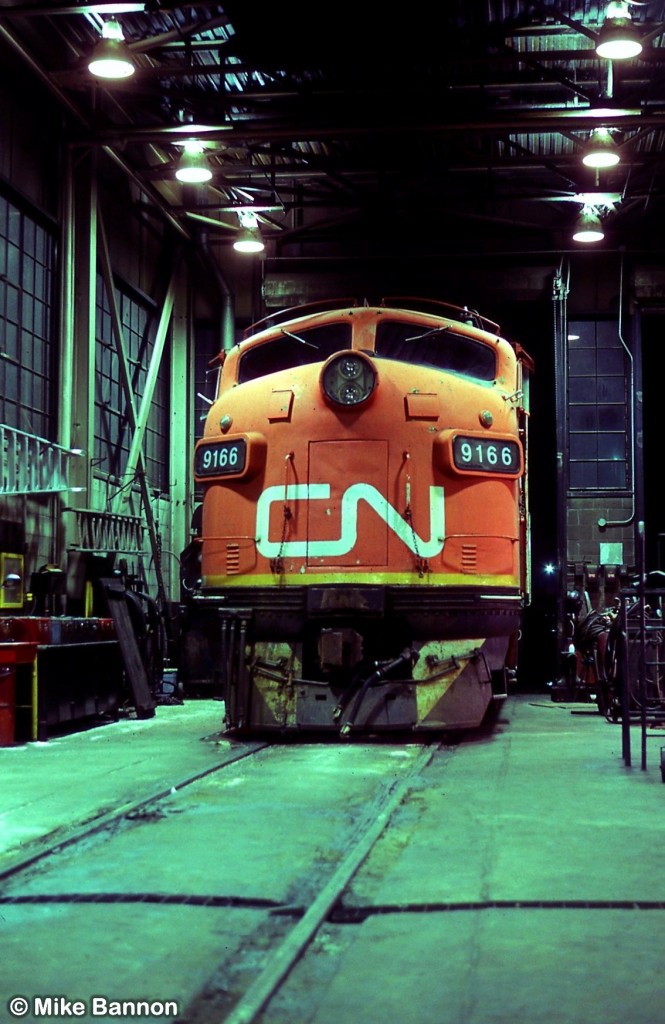 Caption: CN 9166 being serviced at CN Stewart Shop building. Bill Turner photo from my collection.
