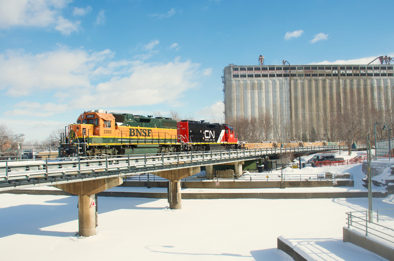 Caption: BNSF 2262 leads CN 500 into the Port of Montreal, with CN 4951 trailing. The BNSF unit replaced CN 4901 earlier this week.