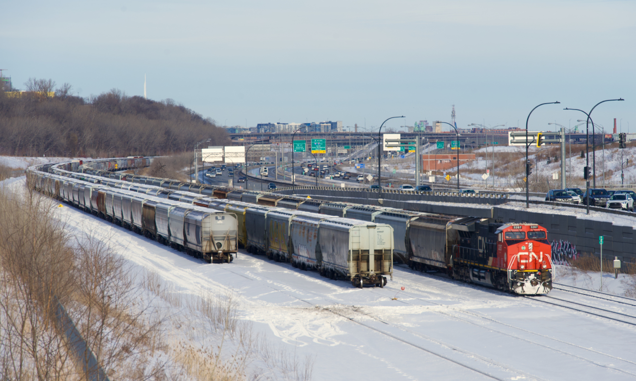 Caption: CN 875 has just arrived at Turcot Ouest, where it will get recrewed and refueled before continuing west with grain empties. More grain cars are parked on Track 29 and the Freight Track.
