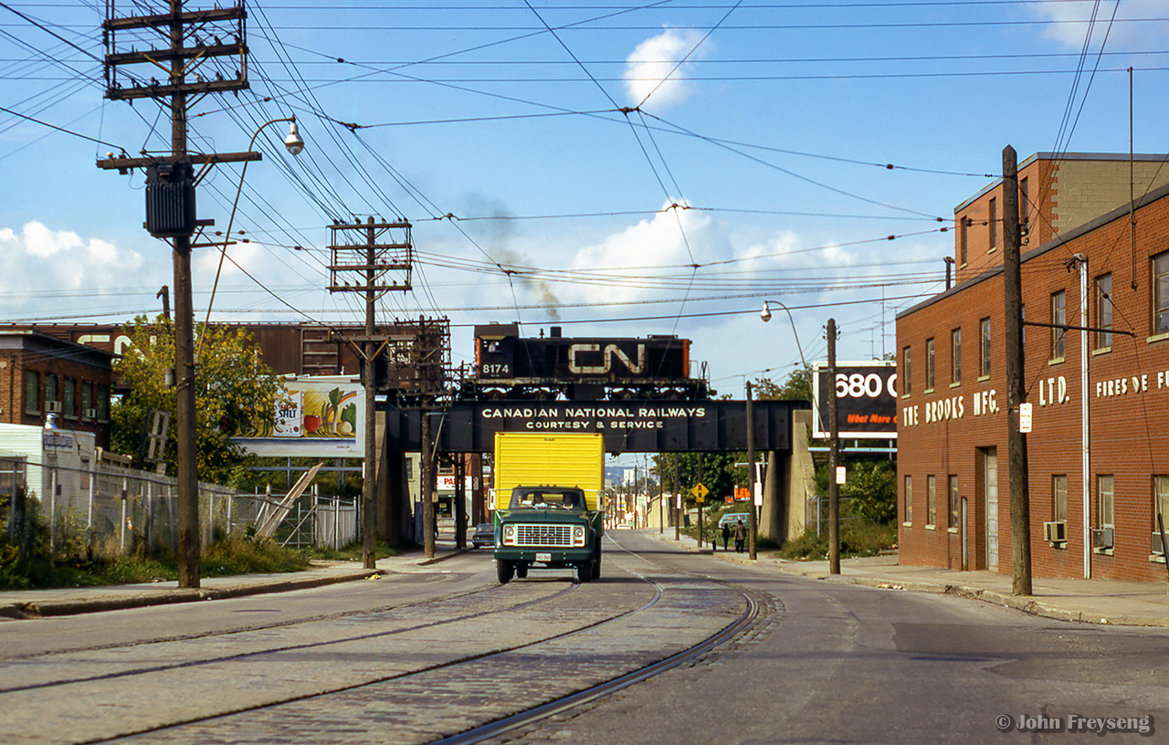 Caption: Working local industries along the Newmarket Sub, CN 8174 rumbles north over Rogers Road. This scene has changed quite a bit, with the CNR bridge lettering now replaced with Metrolinx insignia, and most industries removed. The site at left is now home to a school, while housing has sprung up on the former Brooks Mfg Ltd site at right. Gone too is the Rogers Road streetcar line, which last ran just two years after this photo in July 1974. Further information found HERE.