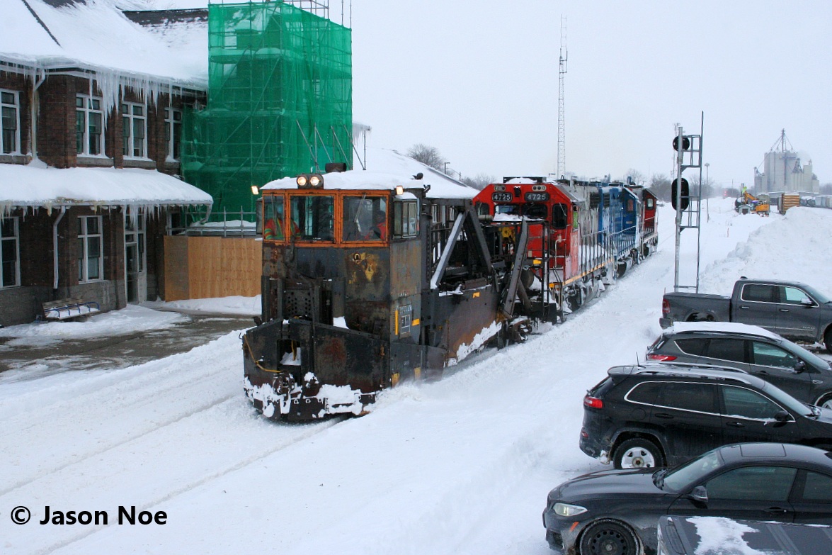 Caption: On February 18, CN L540 was sent from Kitchener westbound to Stratford to plow the Guelph Subdivision towards London ahead of that night’s 87. Upon arrival in Stratford, CN L540 lifted Jordan Spreader # 50948 and track department crews prepared it for it’s run west. The power for L540 was 4725, 4910 and 7512. Later, in the afternoon, CN L568 would arrive in Stratford from Kitchener light power and the crews would swap power.