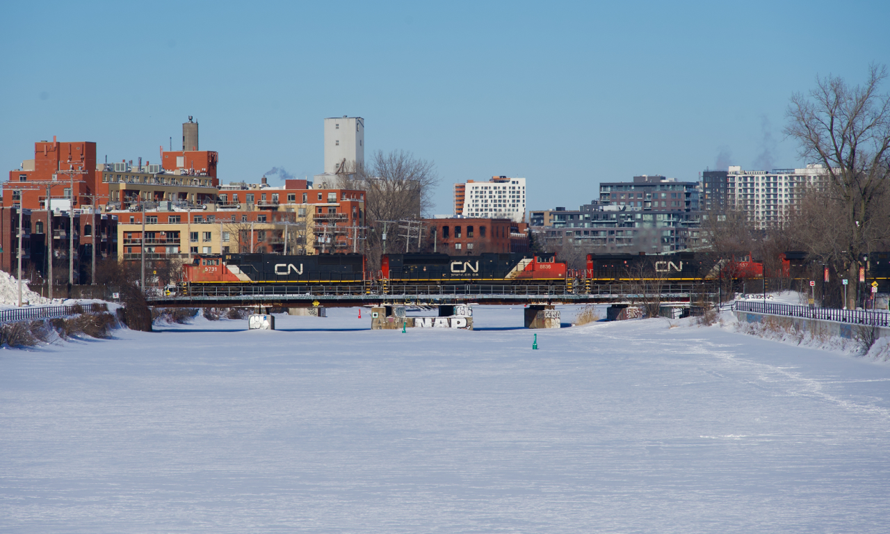 Caption: An SD75I leads CN 527 as it crosses the Lachine Canal after holding for CN 324 and CN X400. It has work to do at Pointe St-Charles Yard before it can continue towards Taschereau Yard.