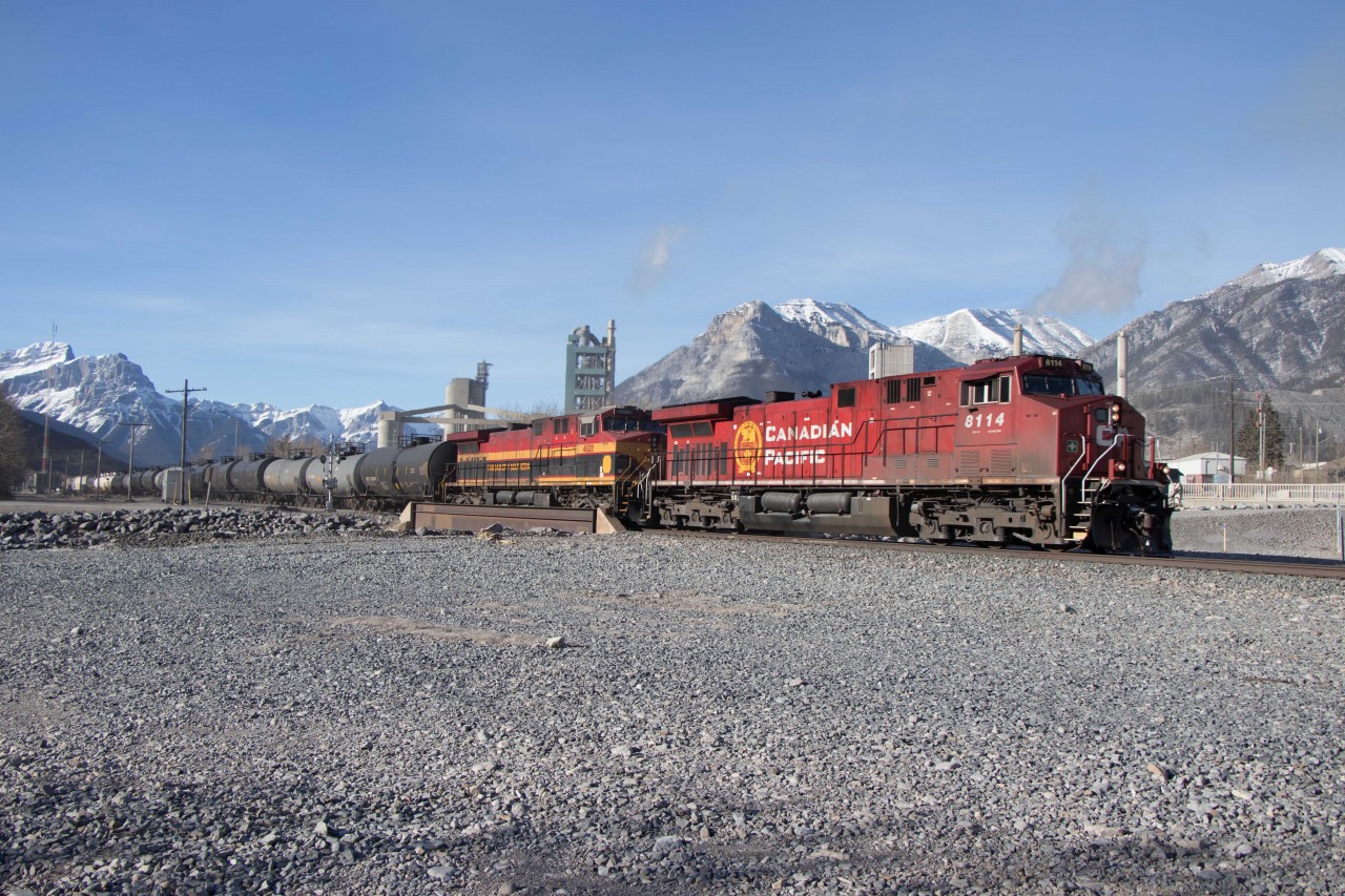 Aided by howling west winds, CPKC200 (Coquitlam-Clover Bar, AB) rolls through Exshaw behind AC4400CWM 8114, KCS AC4400 4620 and mid-train DPU KCS 4617.
