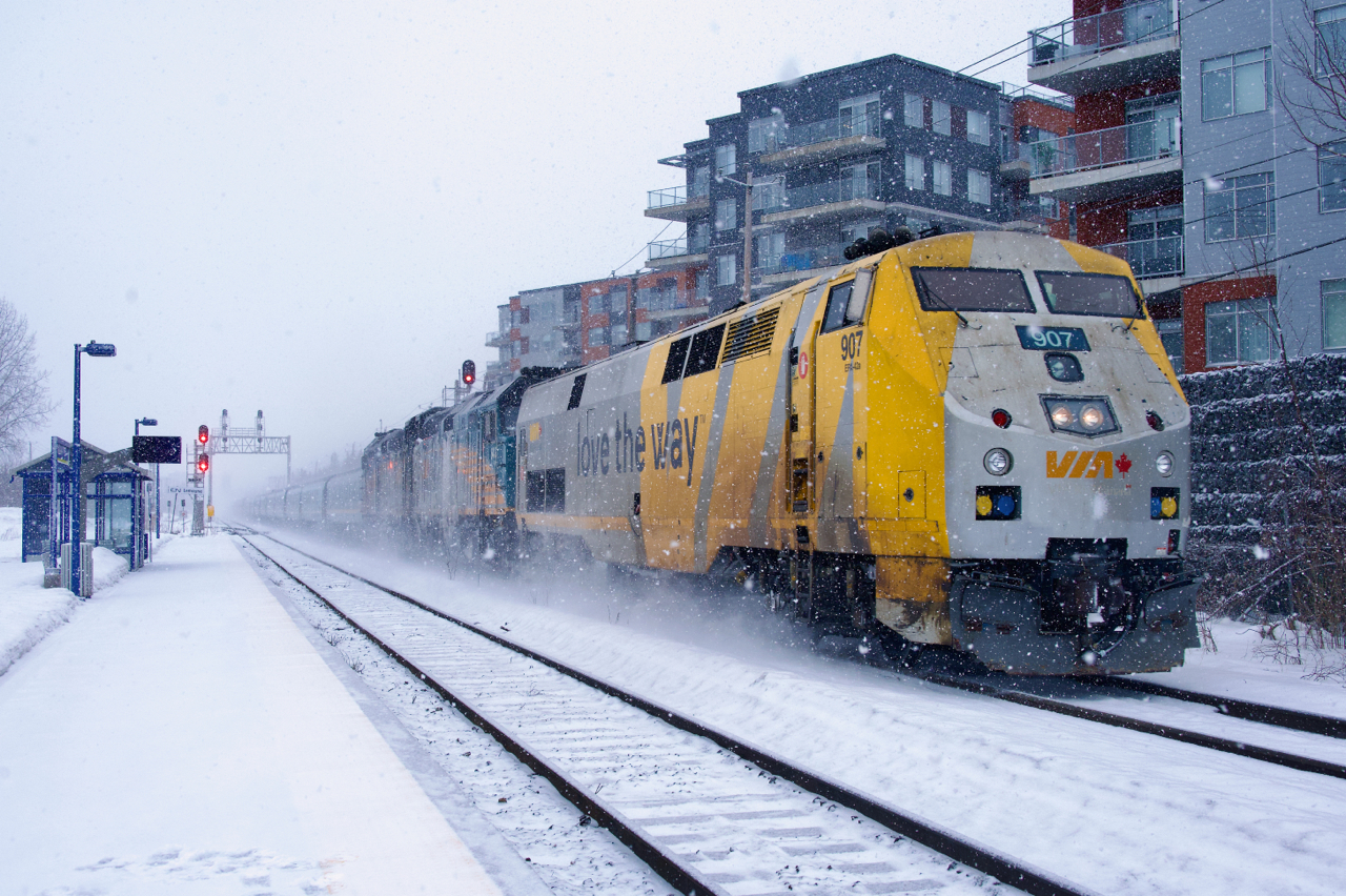Caption: About to arrive at Saint-Lambert Station nearly a full twenty-four hours late, VIA 15 has rescue power VIA 907 leading. After having engine issues and then becoming snowbound at Rimouski, CN sent rescue power to take the train from there to Sainte-Foy, where VIA 907 replaced the two CN units. I believe this is the first time a GE runs on VIA 14/15.