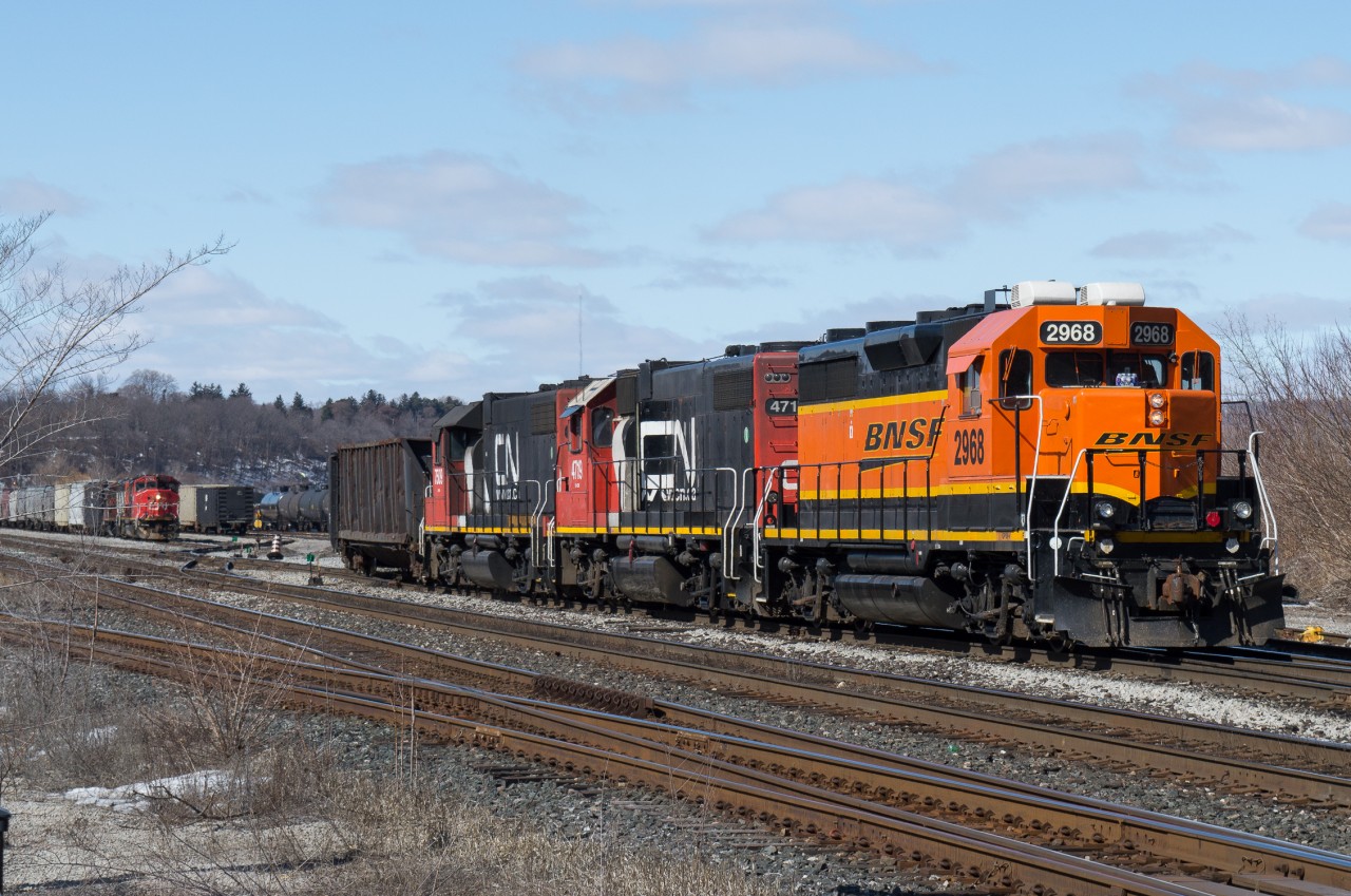 Caption: The 0600 Hamilton Yard Job is seen departing Stuart with two scrap gondolas for Triple M. They have the BNSF 2968 leading, this was the jobs second run out of the yard that morning. Photo taken from the West Harbour GO platform.