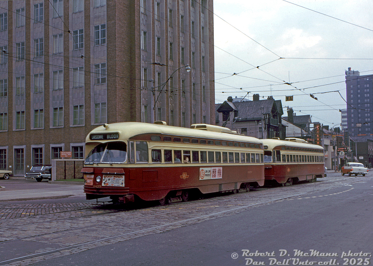 Caption: TTC PCC 4459 and a sister car operate in MU on the busy Bloor streetcar route (in the pre-Bloor-Danforth subway days), heading westbound on Bloor Street West past Bedford Road, passing the exit tracks of the TTC's Bedford Loop. In the background is the Texaco building (Texaco Canada Ltd headquarters), and across Bedford along the north side of Bloor are old Victorian-era houses converted into retail stores for Clare's Sportswear Shop, Steak N' Burger ("Steakhouse" sign) , a Harvey's, Superior Optical Co, and Swiss Chalet (the original and first Swiss Chalet location).