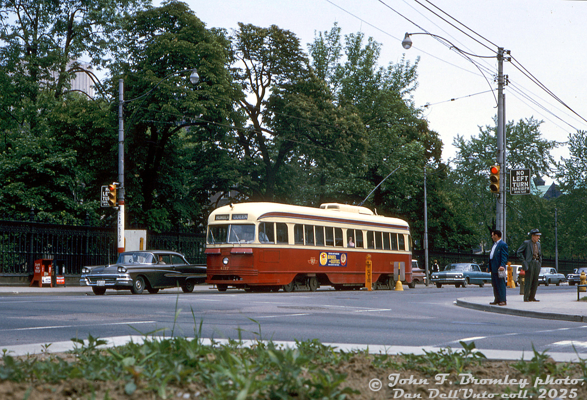 TTC PCC 4217 (A3 class built by CC&F in 1942) pauses westbound on Queen Street West at University Avenue, operating on a Queen run for Humber Loop. Shielded by a wall of trees is Osgoode Hall in the background.John F. Bromley photo, Dan Dell'Unto collection slide.