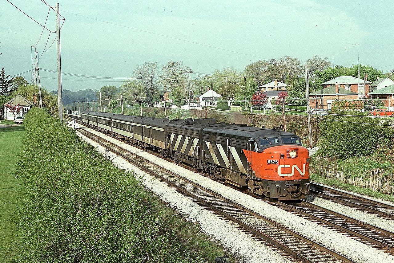 Caption: CN train 70 drifts through Long Branch, Ontario with FPA4 6775 and F9B 6635 for power.