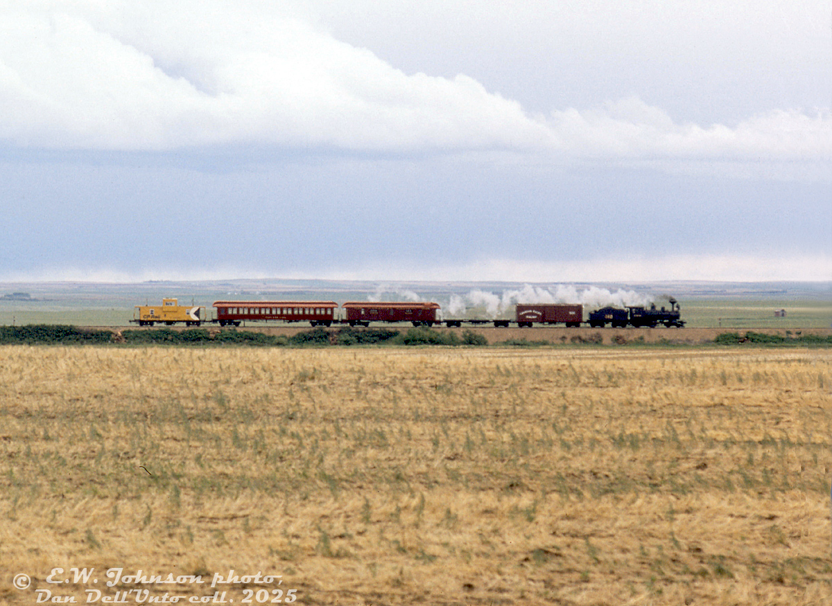 In reality, this is the train used for filming the CBC's The National Dream series on building the CPR, filmed in 1973. The star is Ontario Rail's former Canadian Pacific A2m 4-4-0 136 (borrowed for filming, and done up as 148). It's seen heading westward across the open prairie fields west of Gleichen, Alberta on the CP Brooks Sub. This may have been after filming the track laying scenes in Cassils were complete, and when 136 was reportedly dispatched under its own steam power westward to Penticton BC for filming the Myra Caynon footage.