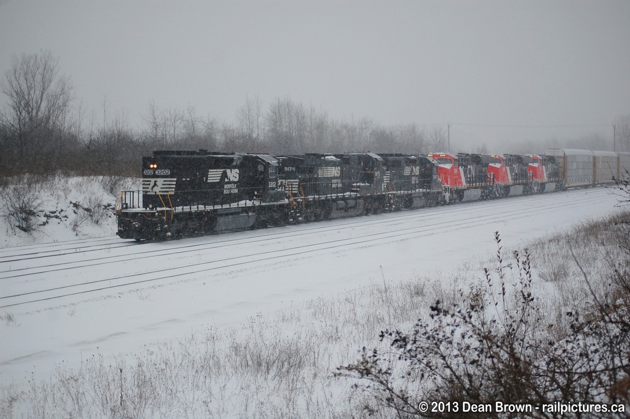 Caption: NS H53 with NS SD40-2 3202, NS C40-9W 9175, NS GP38-2 5667, and three brand-new units from GE Erie, PA, are being delivered. CN ES44AC 2859, CN 2862 and CN 2861