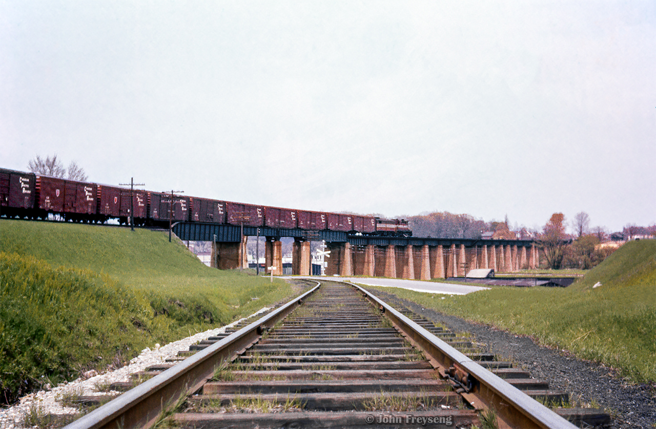 Caption: A string of CPR block lettered boxcars make up the headend of an eastbound timetable freight at Port Hope. Dropping downgrade in the foreground is the former CN Lakefield Sub, which ran Port Hope - Millbrook - Peterborough - Lakefield. Construction would begin under the Port Hope, Lindsay, & Beaverton Railway in 1855, with the line abandoned in sections beginning almost a century later. The Port Hope - Millbrook section was lifted first in 1951, with Millbrook to Peterborough following in 1964. The Peterborough to Lakefield section, constructed under the Midland Railway circa 1870, would be abandoned in 1989. The section of track seen here, was the remaining 1.8 mile Port Hope Town Spur, serving a handful of customers.