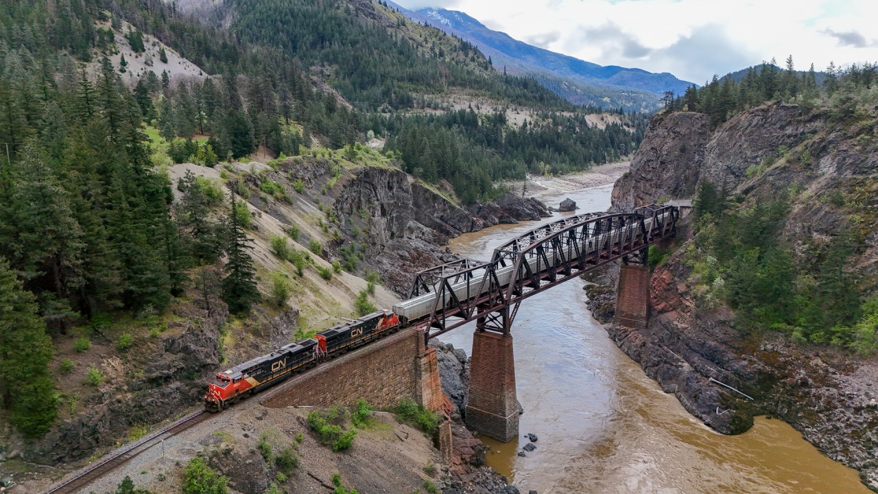 CN G 83451 21 emerges from a tunnel and immediately crosses the Fraser River at Cisco.