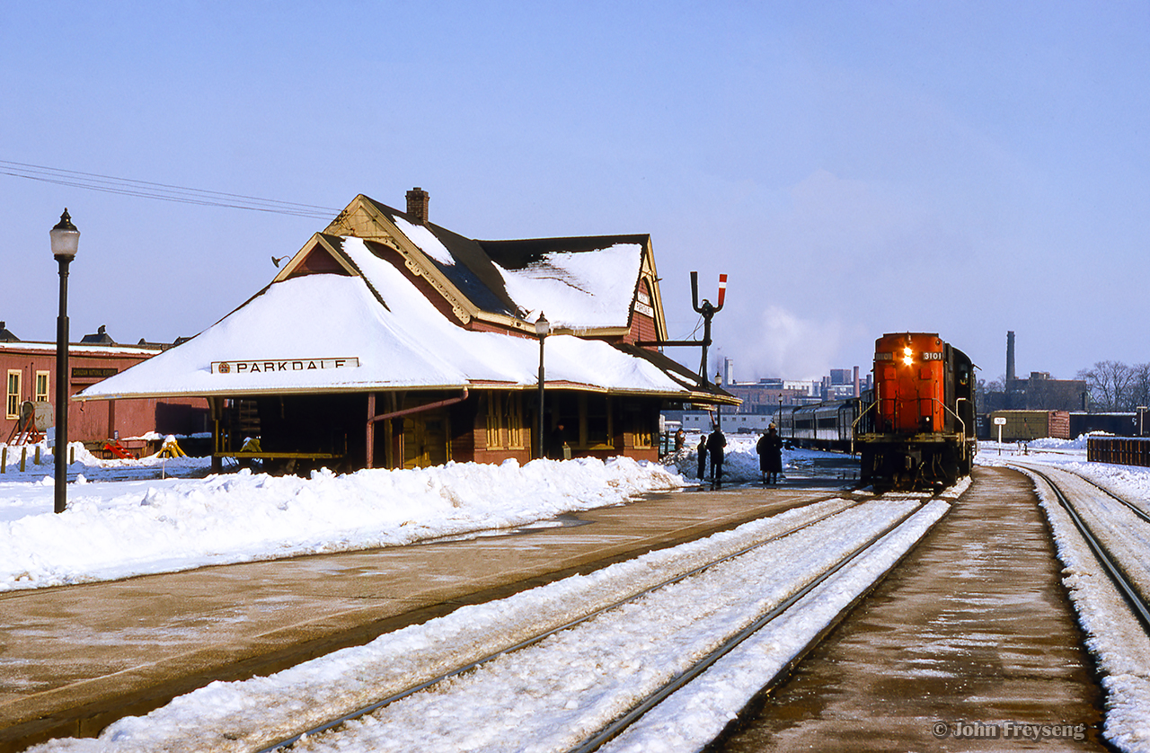 AWESOME PHOTO! Nice to see a photo of the old Parkdale CN station still in its red / cream paint scheme. Noticed on the name sign, a symbol to the left of ‘PARKDALE’. Is this a City of Toronto logo, of some sort?