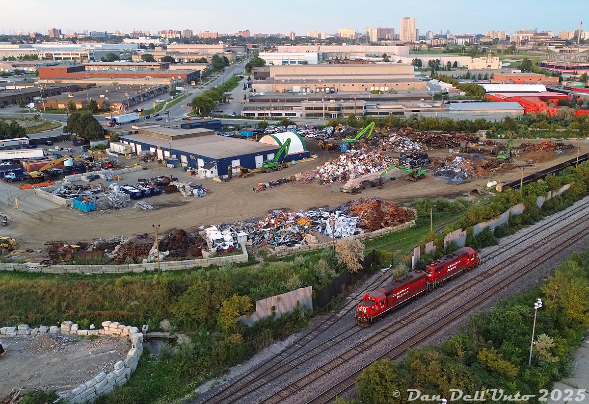 Caption: After arriving north from further down the line, CP GP38-2's 4522 (a former UP GP40X) and 3055 run around their train on the service track in the North York area of Toronto at Emery, preparing to start switching local industries. They're seen passing by the Gerdau Metals Recycling yard at Weston Road and Fenmar (that may have originally been H. Solman & Sons in the late 70's), where no shortage of scrap automobiles, trucks, trailers, bins and any other metal object of value gets cut up, crushed, processed, sorted and shipped out for recycling. A siding into the yard lets CP spot and lift gondolas inside for scrap metal loading.