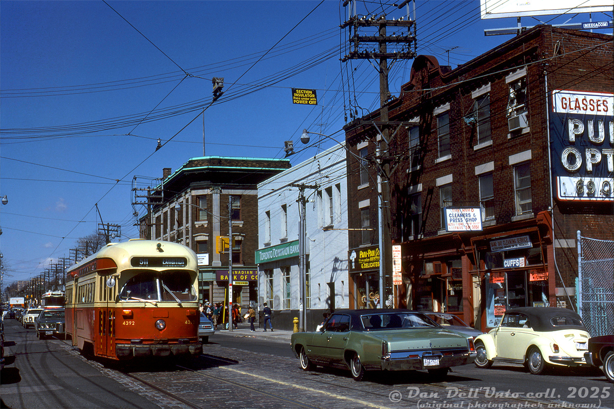 Caption: Rumbling south in traffic on Bathurst Street, TTC PCC 4392 (A6-class, CC&F 1948) heads past some of the local banks, restaurants and dry cleaning shops just past Bloor Street on a southbound 511 Bathurst run for Exhibition Loop. Important institutions like banks often had corner branches at many of the major intersections in the city, competing with each other for business. CIBC resides at the northeast corner here, and TD opposite to the southeast. Note the Brewer's Retail (The Beer Store) delivery van in the distance, and the northbound CLRV about to enter Bathurst Subway Station.