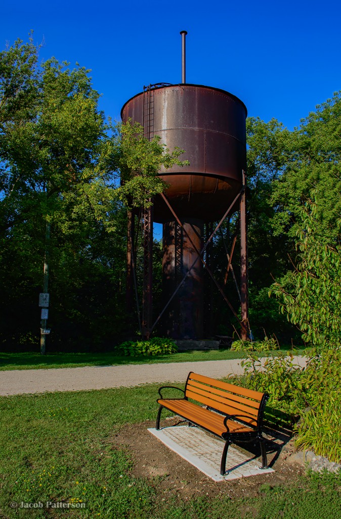 Caption: The old steel Canadian Pacific Railway steel water tower at Blyth, ON, located along the Goderich Subdivision, has been demolished. Towering over the Guelph to Goderich Rail Trail, work to remove the privately owned structure began on May 21, finishing up the following week. Across town from the former CPR yard, both the CNR and CPR (relocated) station remain in town.