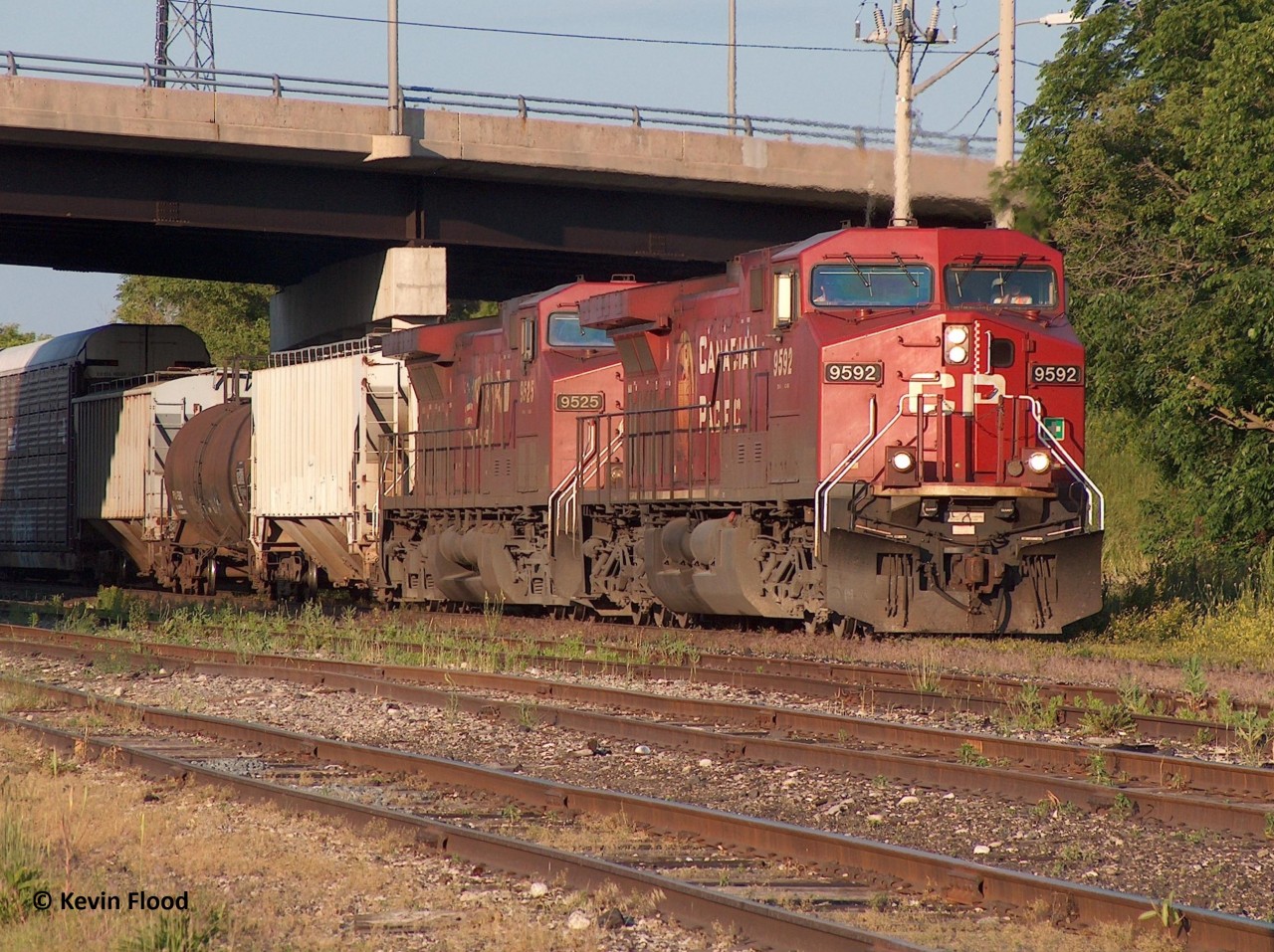 Caption: A CP westbound heads through Galt (Cambridge), ON under some nice evening light with a pair of AC4400CWs elephant style with two different schemes: the current beaver scheme and the dual flags trailing; engine numbers 9592 and 9525.