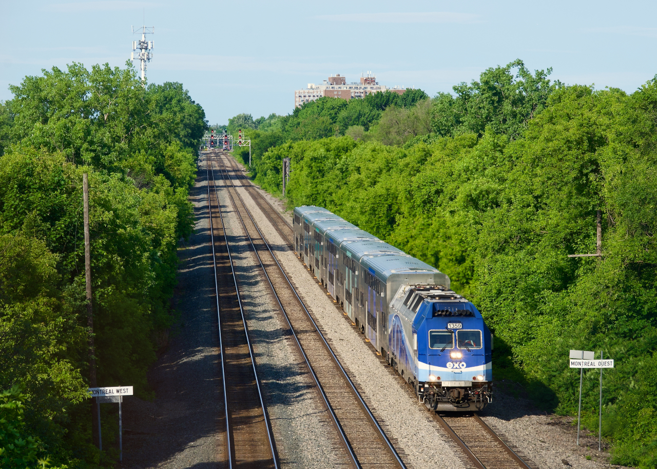 EXO 174 is eastbound on the Westmount Sub after its stop at Montreal West Station. It has a CRRC consist; at present four of five consists on the Saint-Jérôme line are so equipped.