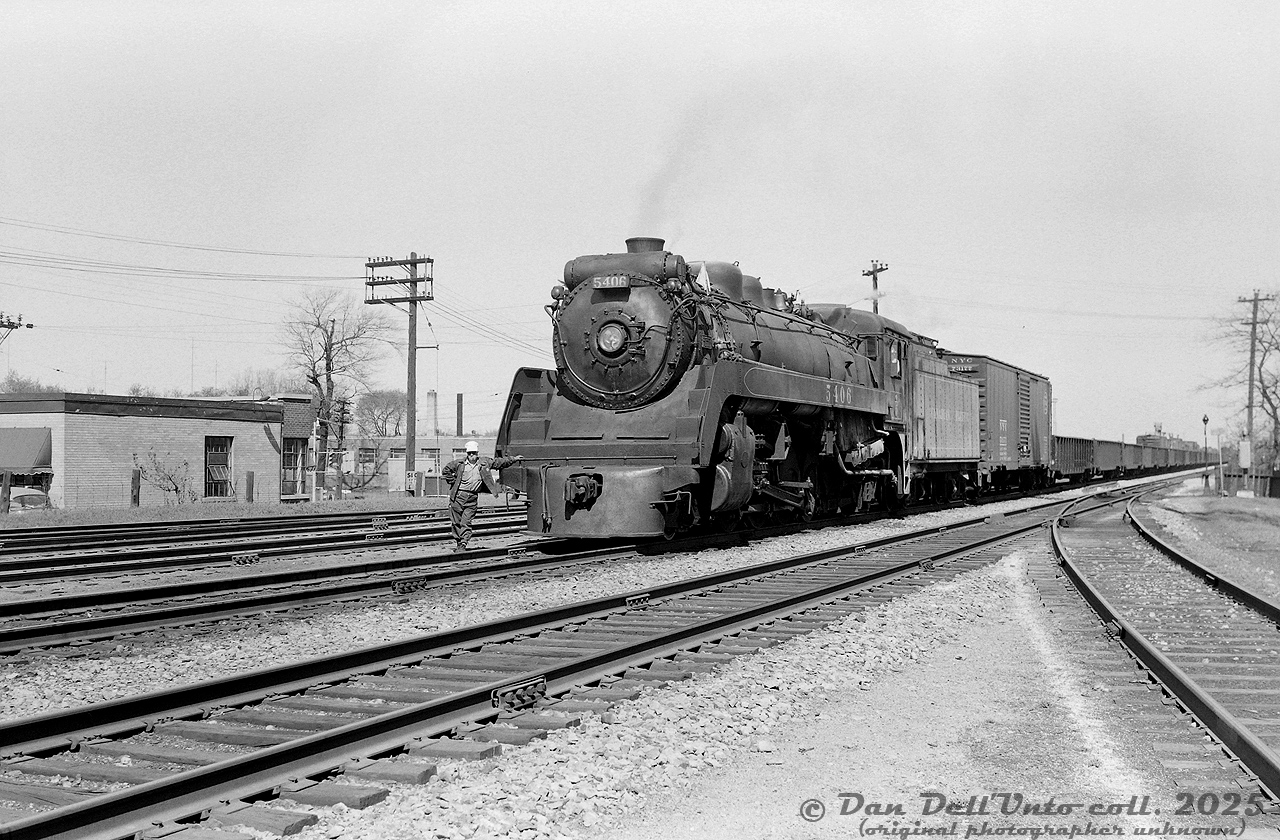 Caption: Canadian Pacific P2g "Mikado" 5406 (built by MLW in 1940) sits at Scarlett Road at the west end of CP's Lambton Yard (on the Galt Sub mainline) in West Toronto. Presumably, the crewmember posing by the pilot and open knuckle coupler is waiting for a helper or "assist" engine to arrive and couple on the front for the trip west on the Galt Sub, climbing the grades up to Orr's Lake.