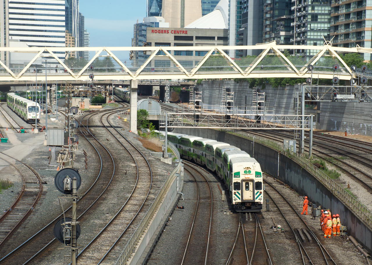 Caption: An older cab car leads a westbound past a work crew a bit west of Union Station.