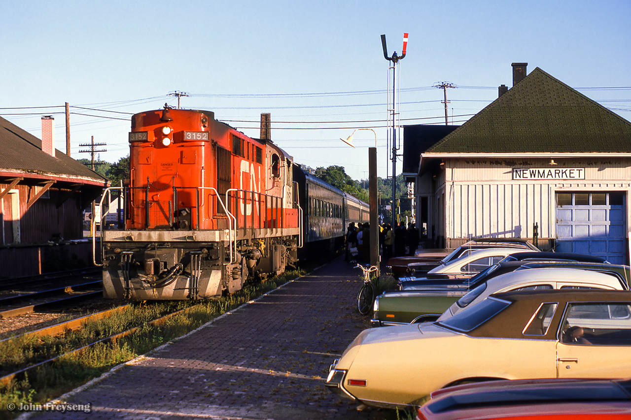 Thanks for all your comments and information. This picture was taken on my summertime commute to work in downtown Toronto, driving from my parent’s summer cottage at Eastbourne (once a stop on the T&Y line to Jackson’s Point/Sutton) to Newmarket, returning the same way in the evening. VIA Rail took over the Barrie and Stouffville commuter trains in the late 1970’s, and in July 1982, VIA announced that they were cutting a fifth of their passenger service network effective Tue Sept 7 (day after Labour Day) which cuts included the Barrie and Stouffville commuter trains. GO Transit took over both these services on Sept 7th with the Barrie train cut back to Bradford, using GO train equipment. CN’s Tempo train diesels were often used on the Barrie and Stouffville commuter trains, right up to the last day of operation by VIA on Fri Sep 3, 1982 – these commuter trains did not operate on weekends or Labour Day. On that Fri, I rode the last commuter train to Barrie with the ceremonial unloading of a coffin at Bradford by Barrie commuter train supporters commemorating the end of the service beyond Bradford.