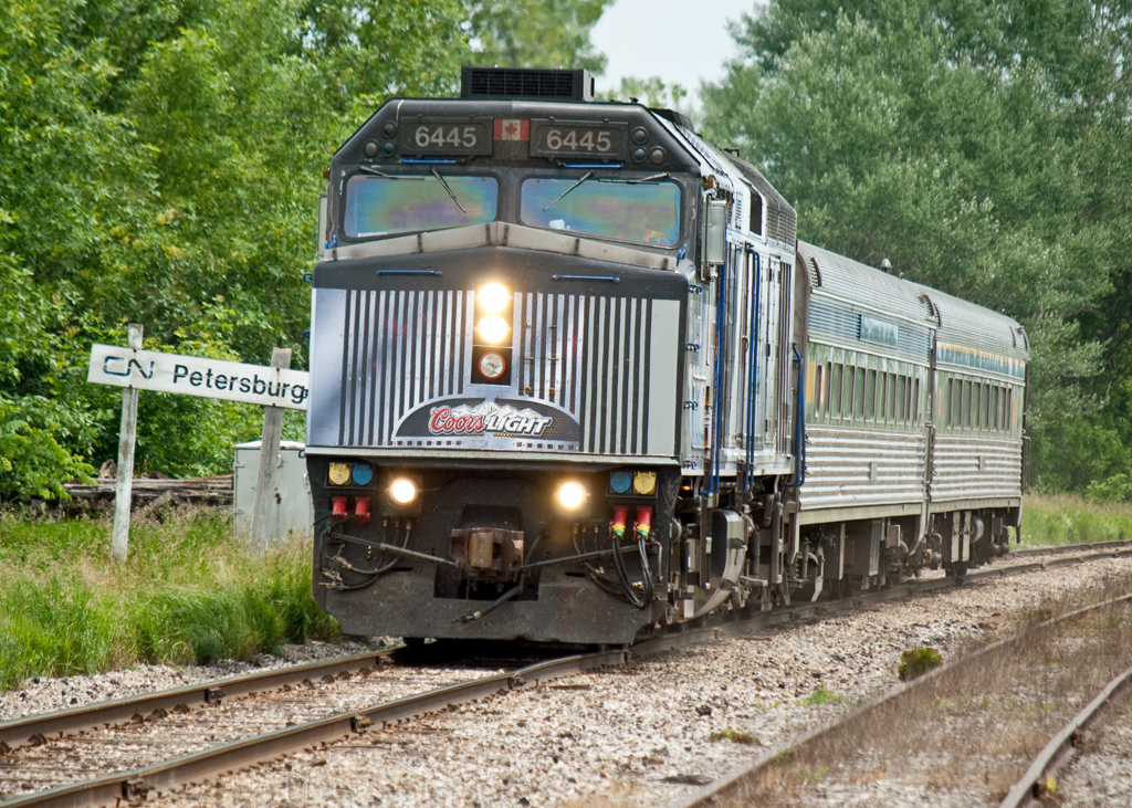 Caption: VIA 6445 in the Coors Light Sliver Bullet Express scheme pulls VIA #85 through Petersburg.