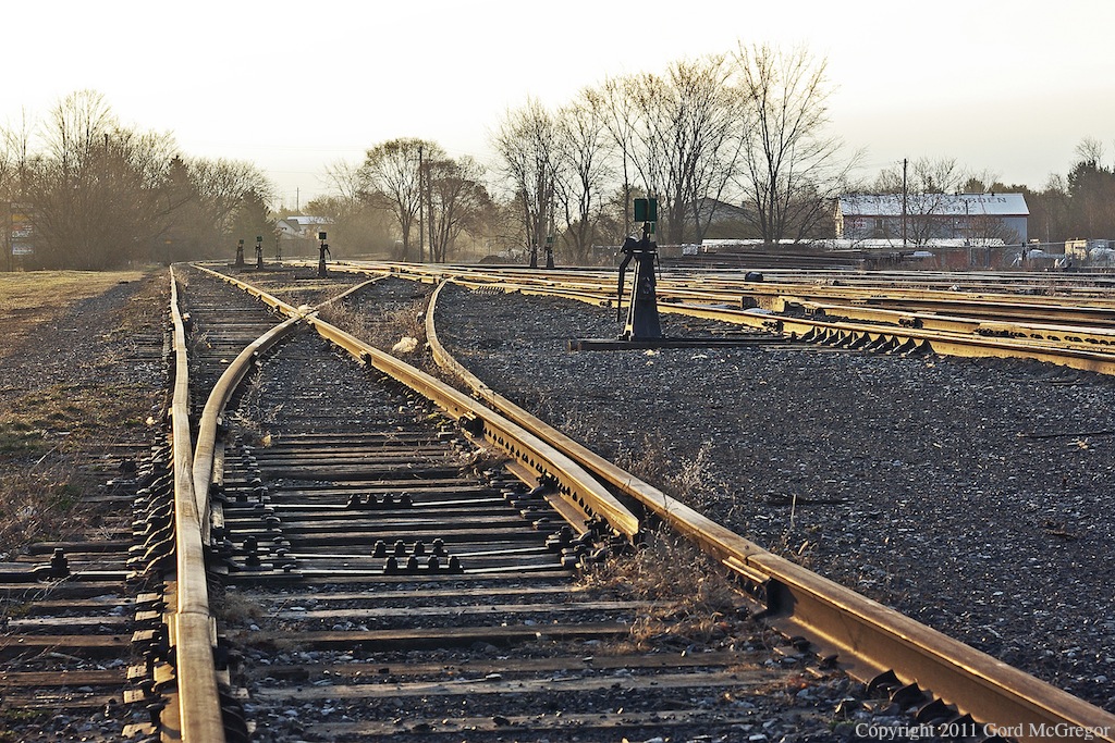 Caption: The Havelock yard is quiet as the sun reflects off the rails and many unused switches and tracks symbolize a once busier era.