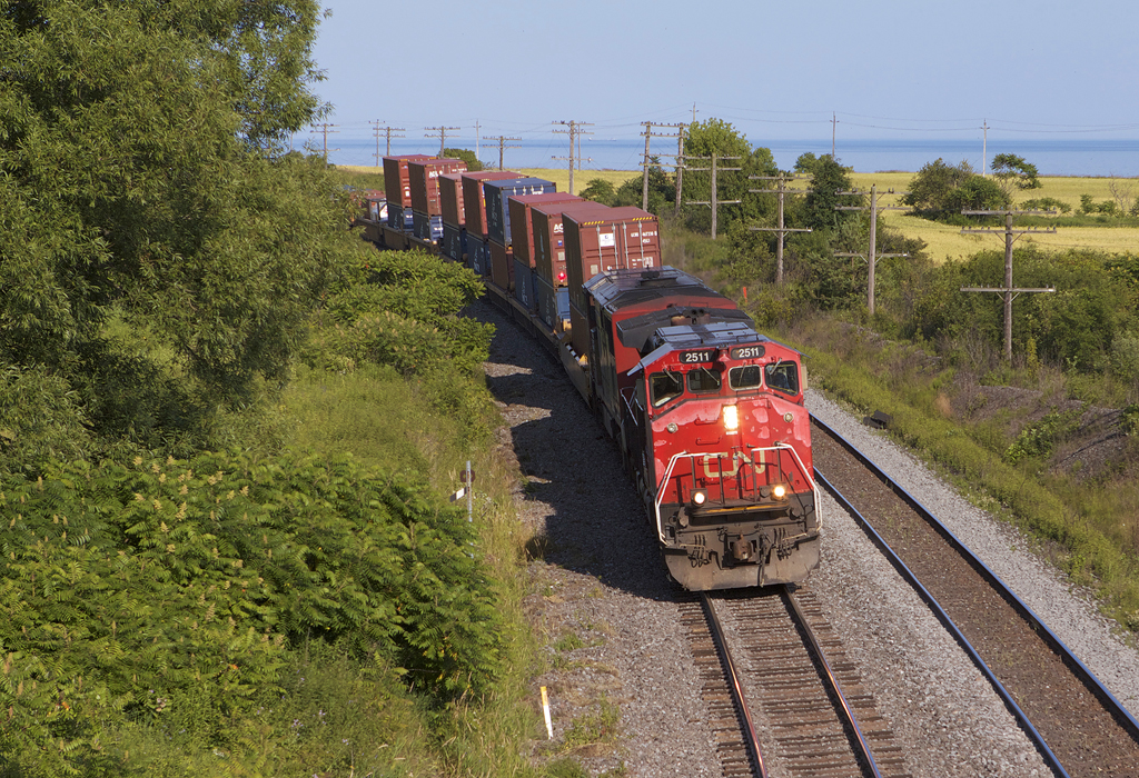 Caption: A C44-9WL locomotive leads a CN westbound thru Lovekin.