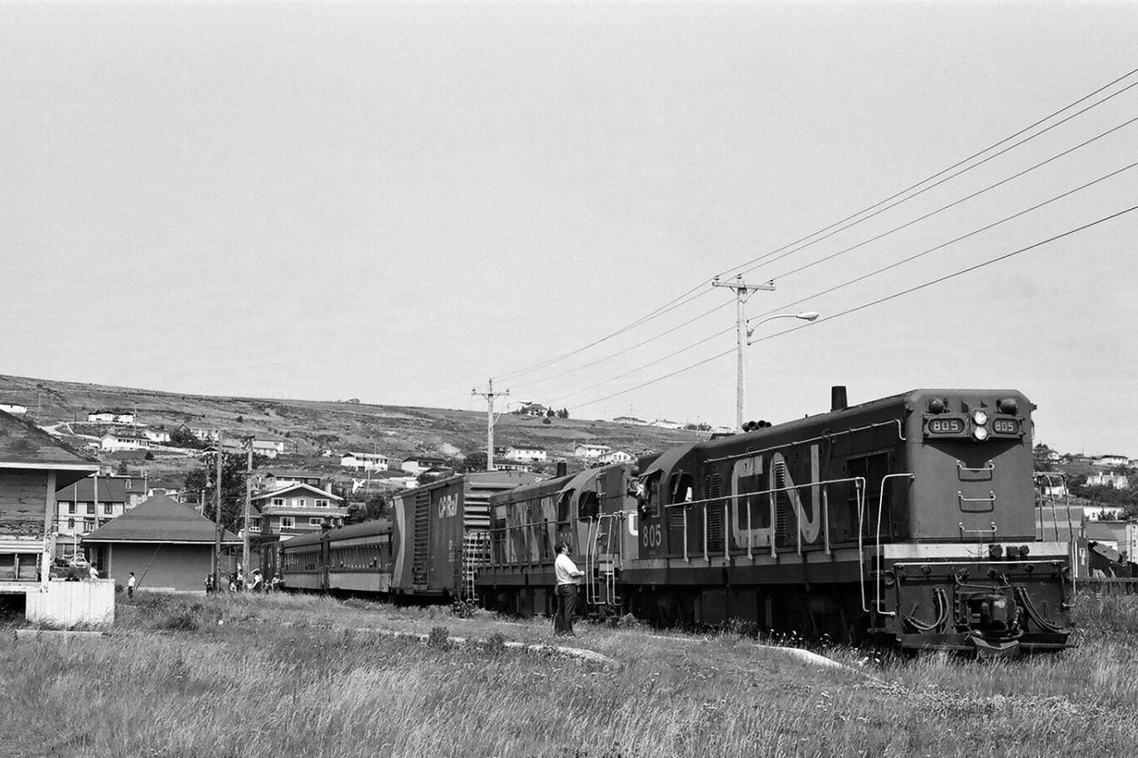 That summer followed / photographed Carbonear mixed trains 231 – 232 and Bonavista mixed 205 – 206: most passengers were families taking children for an afternoon train ride. Most boardings seemed near the terminal station: turnaround time at Carbonear was 20 minutes and at Bonavista 30 minutes. In this photo about eight passengers on the platform and perhaps double that on the train.