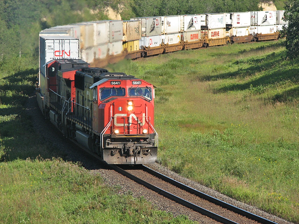 Caption: CN Q104 rounds the curve with 5641 on the point at Rivers Mb.