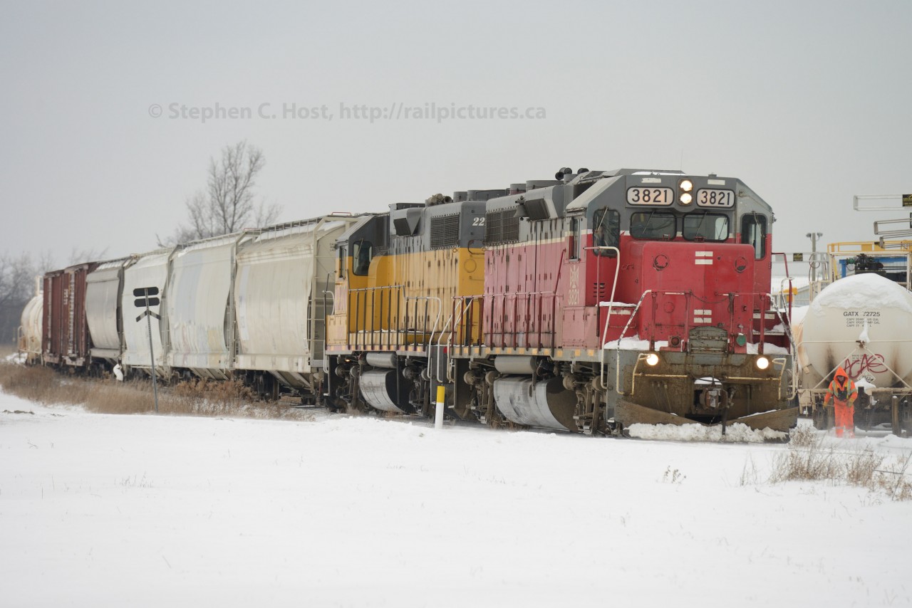 Caption: C c c c ooooold The first stop on the Fergus spur is Flo-Chem - one of the few industries in the area leftover from the CN days. The conductor has checked the cars at Flochem and is walking to throw the switch. The hogger, keeping warm in the cab with a smoke is watching the traffic on HWY 24 back up - the crossing bells and lights are already ringing - a reminder that the signals are still set for the days when the Fergus spur handled 40 MPH RDC's and freight trains in the 60's and 70's - to the chagrin of drivers.