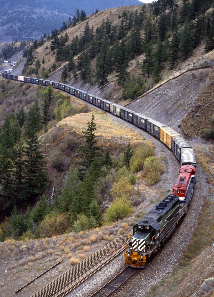 Southbound BCRail freight downgrade approaching Lillooet.