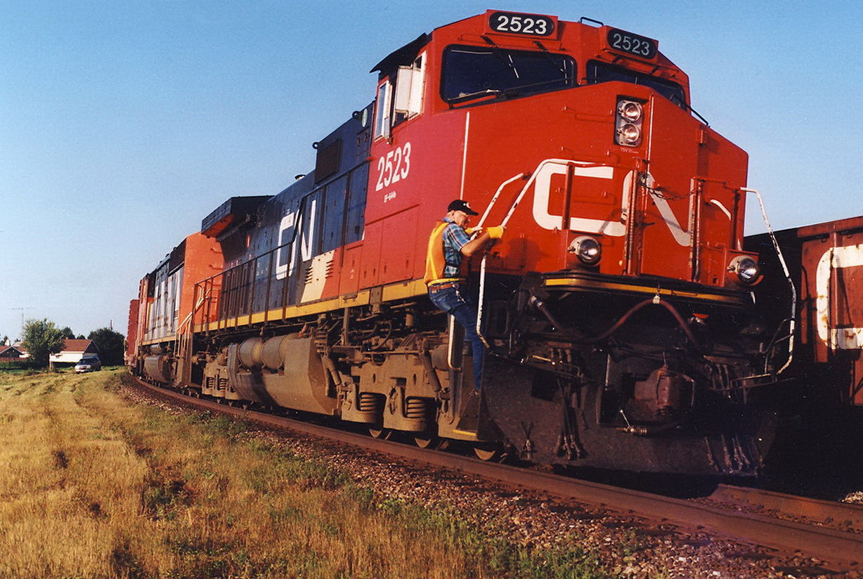 Caption: CN 305,s conductor climbs down as it comes to a stop to watch the 308 moving in the siding.