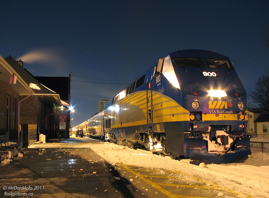 Caption: On a frigid winter's night, VIA train #89 makes its brief scheduled stopover at Brampton Station. P42 class-unit 900 leads the charge from Toronto to Brampton, Georgetown, and eventually Sarnia this evening. The reddish-purple light reflecting on the lead unit comes from the pair of dual signaltowers just past the station, both lit up red but with a single green awaiting 89's highball westward.